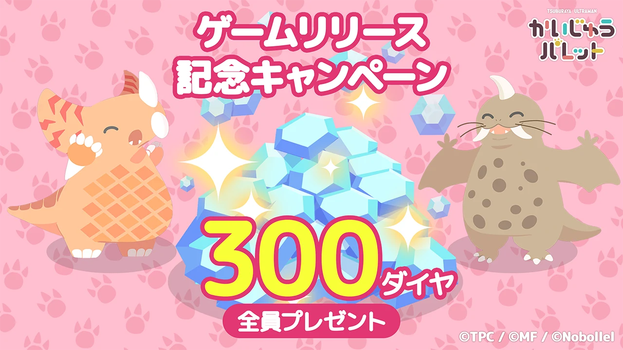 『かいじゅうパレット』のリリースを記念して、下記期間中にゲームを開始した方全員にゲーム内アイテムの「ダイヤ」を300個プレゼントいたします。